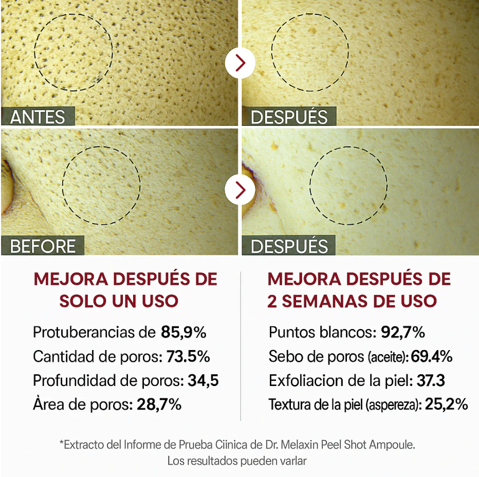 Desde la primera aplicación notarás la piel más suave y luminosa. Con el uso constante, el tono y la textura de la piel mejoran visiblemente en pocos días.